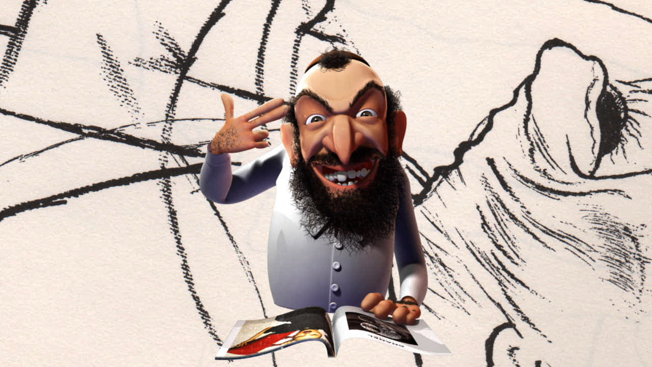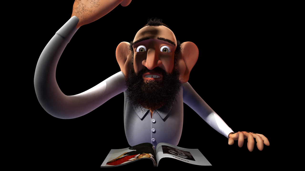 Its only character is a jarringly stereotypical Shylockian Jew, with hooked nose, yarmulke, frizzed hair and beard and misshapen teeth, who is rendered in sleek high-definition animation (but only from the waist up). Sometimes benign, sometimes demonic, this gnomic cross between a Hasidic Woody Allen and a Semitic Yosemite Sam lip-syncs the sexy, whispered dialogue of a pair of young lovers that evokes the indie-film subcategory known as mumblecore, while executing repeated rap-music hand gestures.