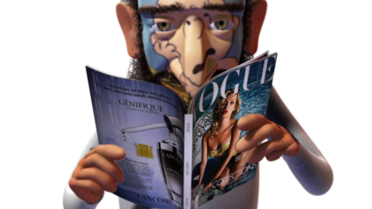 From start until finish of ‘Animation, Masks’, we are faced by an aged, cartoonish Jewish figure, the embodiment of an ages-old and much-abused stereotype with his wiry beard, huge nose, and yarmulke perched atop a balding crown. In his hands he holds a copy of Vogue magazine. Where his legs should be, there is nothing but an abruptly truncated torso, and without them he appears to float in space. Throughout the video, his kindly eyes are fixed directly upon ours, their smooth rendering in CGI lending them surprising depth. He is the video’s sole character, though by the end of it we know nothing ‘about’ him, so to speak. I will refer to him as ‘the Jew’, since he fashioned after that fictional being.