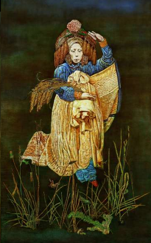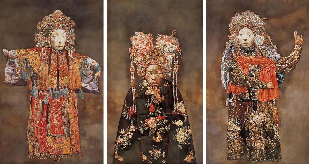Liu Hong Yuan, an amazing painter with outstanding skills, trained in the best art school in Beijing. She is very much into the tradition of Beijing opera or the Qing dynasty (1644-1911) culture that was dark, splendid, depressing and a little peculiar. Her paintings not only displayed traditional patterns and forms, but interpreted the true, essential and the dark side of the old culture. By applying classic techniques of European oil painting of seldom been seen anywhere in the world today, she painted the first several layers totally in white, building up thickness, then glazed colors making her paintings look as if they were sculptured on the canvas. Her enormously detailed works consisted of every jewel worn by her lady, the embroidery patterns of her clothes, the porcelains and fruit blossoms flowers on tables. Her bizarre and classic paintings will always haunt you.