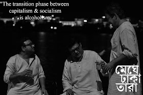 Kamaleshwar Mukherjee has used the metaphor of Bangabala in the closing shots of his film, now in 'colour', where a young girl, Bangabala, from Ghatak's Jukti Takko Aar Golpo is given concrete shape to look like the rape victim Phoolmoni in the mental home. She waits for Neelkantha out in the fields, as if inviting him to join her back, to his roots in Pabna and other places in East Pakistan once a part of undivided Bengal. Mukherjee beautifully suggests the 'liberation' of Ghatak who frees himself to join his 'Bangabala' to go on a new journey and perhaps begin to rewrite his life again. Phoolmoni is liberated and so is Neelkantha. The director does not use the darkness of death but the brightness of a yellow horizon in the distance, shown in bright colour, where the two figures become smaller and smaller till the film freezes to a close.